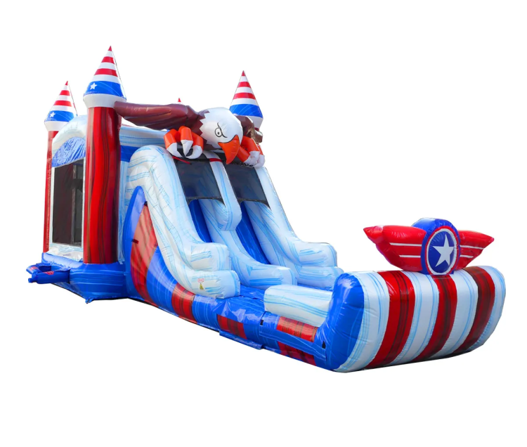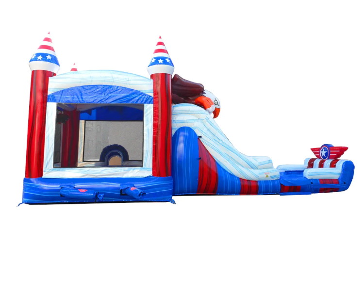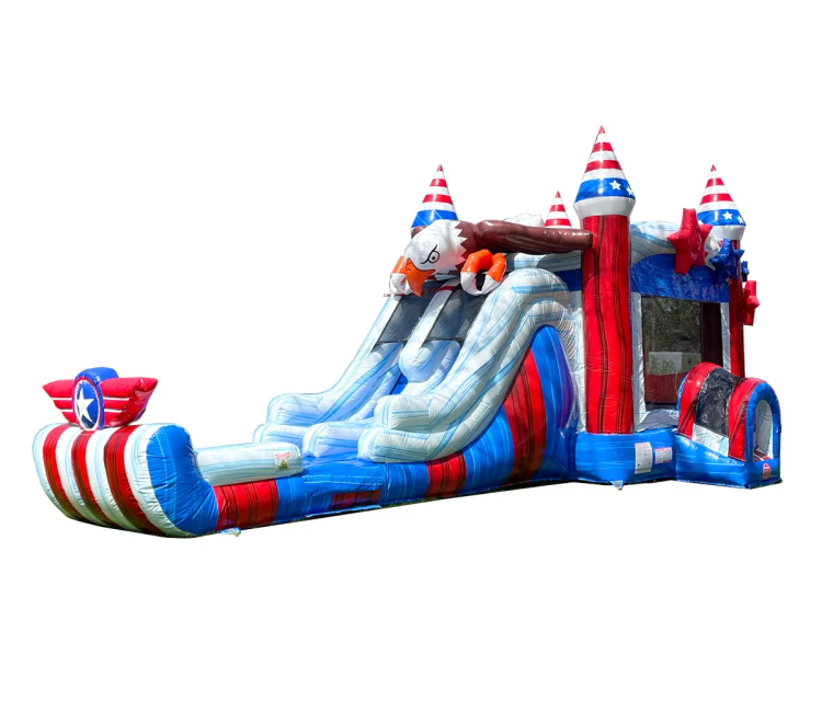 Bring the thrill and excitement to your next party or backyard bash with our Freedom Flyer DL Combo! This dynamic combo unit features two racing slides and a spacious bounce area, perfect for kids (and even teens) who want sliding speed and bouncing fun. The bold eagle-themed design and vibrant colors make it a show-stopper at birthdays, family reunions, church events, school functions, or summer block parties.
